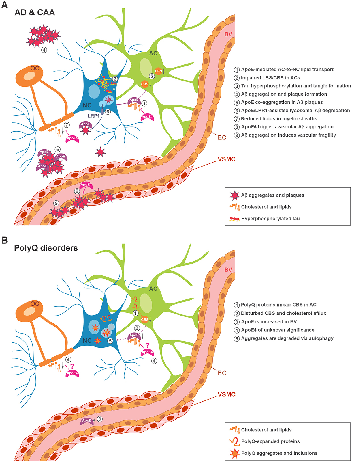 Figure 1. Illustration of pathogenic protein aggregate sites in the monogenic and sporadic neurodegenerative disorders covered in this review, and the known contribution of lipid metabolism and ApoE in the respective disorders. (A) In Alzheimer's disease (AD), neurofibrillary tangles composed of hyperphosphorylated tau accumulate within neurons, while Aβ deposits in the form of amyloid plaques are found in the extracellular space, where activated astrocytes may contribute to their uptake and removal. In cerebral amyloid angiopathy (CAA), amyloid plaques accumulate in the walls of blood vessels. (B) In Huntington's disease (HD) and spinocerebellar ataxias (SCAs) types 2 and 3, the respective disease-associated polyglutamine (polyQ)-expanded proteins form intracellular aggregates in the cytoplasm or nucleus of affected neurons. Characteristic events are numbered and described in the respective panel. AC, astrocyte; NC, neuronal cell; OC, oligodendrocyte; LBS, lipid biosynthesis; CBS, cholesterol biosynthesis; BV, blood vessel; EC, endothelial cells; VSMC, vascular smooth muscle cells; LRP1, lipoprotein receptor-related protein 1.