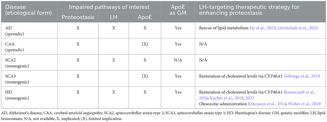 Since protein aggregation is a hallmark across multiple sporadic and monogenic neurodegenerative disorders, current efforts focus on reducing these intra- or extracellular deposits or their sources. Strategies to activate often-compromised proteolytic systems, such as autophagy and the UPS, include genetic and pharmacologic manipulation of pathway-related genes, modification of their upstream regulators or effector elements, and the targeting of substrate proteins via posttranslational modifications (Dantuma and Bott, 2014; Le Guerroué and Youle, 2021; Nixon and Rubinsztein, 2024). However, thinking beyond conventional approaches by including additional dysregulated, targetable pathways can broaden the strategic range. This may enable the development of novel, potentially more feasible interventions, that not only restore proteostasis but also address other pathologically impaired molecular mechanisms. Here, observations in monogenic diseases with a clearer molecular etiology can offer an advantage in assessing the robustness of identified points of action. One such compromised, broader pathway may be lipid metabolism—particularly the involvement of one of its key components, ApoE, across various neurodegenerative disorders (Estes et al., 2021; Fernández-Calle et al., 2022). Numerous studies have demonstrated that lipid metabolism and autophagy modulate each other reciprocally, a relationship that becomes especially apparent when considering that autophagosomes and lysosomes are lipid-membrane vesicles, and that one autophagy protein, LC3, requires lipidation for activation (Jarocki et al., 2024; Xie et al., 2020). The regulatory effects of lipids on the UPS are less well understood. However, ubiquitination and the UPS play important roles in regulating lipid biosynthesis and turnover (Jiang and Song, 2014; Loix et al., 2024). Consequently, direct or indirect enhancement of autophagy may alleviate the burden on an overwhelmed UPS by restoring proteostasis—while simultaneously exerting beneficial effects on UPS-controlled lipid homeostasis. Exemplary studies conducted in SCA3, HD and, to a lesser extent, SCA2 models convincingly demonstrated that modifying cholesterol biosynthesis can ameliorate disease symptoms in vivo by enhancing autophagy and the UPS (Kacher et al., 2019; Nóbrega et al., 2019) (Table 1). Similarly beneficial effects were observed with small molecules that counteracted the autophagy-suppressing influence of the ApoE ε4 allele (Balasubramaniam et al., 2024; Parcon et al., 2018).
