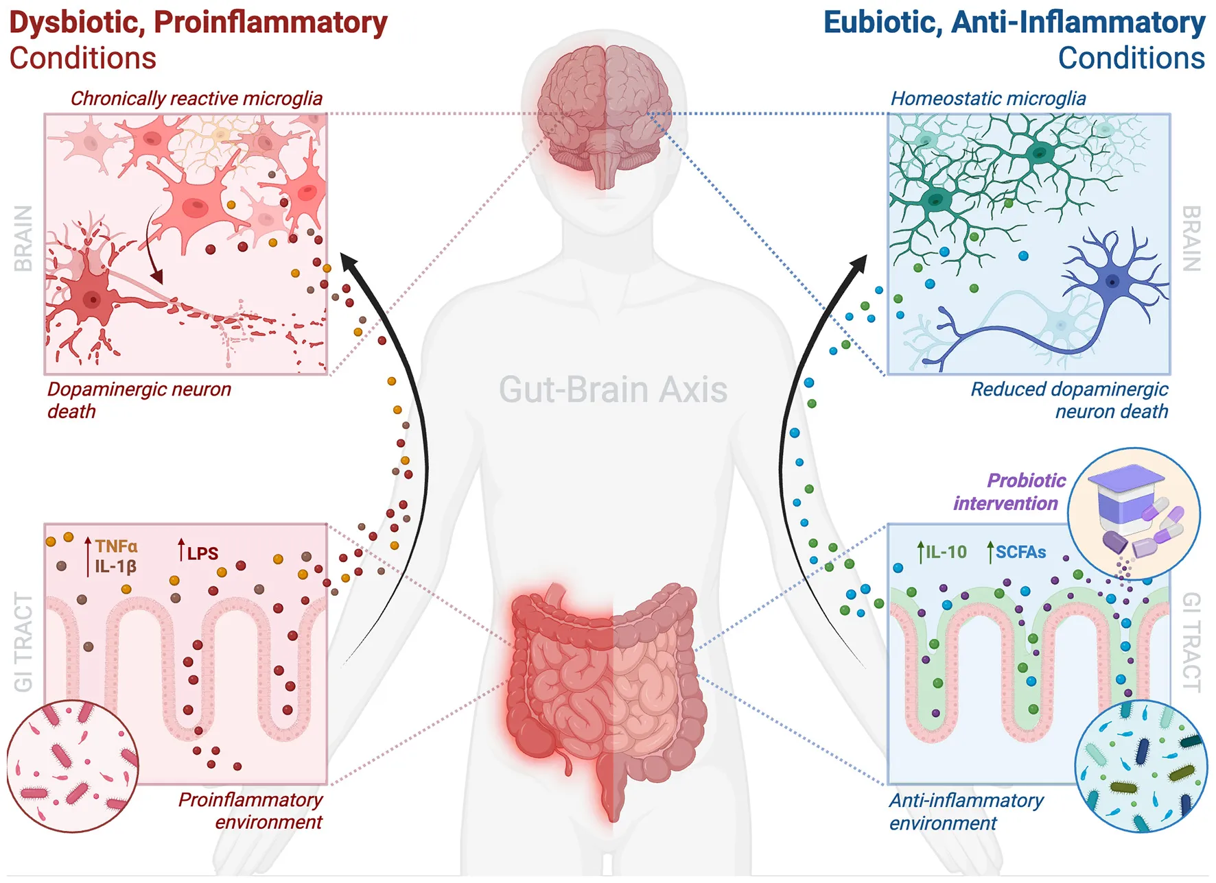 Growing evidence supports the existence of a bidirectional GBA in PD, with gut dysbiosis contributing to or potentially even driving microglial dysfunction and neurodegeneration (Pfaffinger et al., 2025; Xiang, 2025). Preclinical studies demonstrate that probiotics have potential to restore GI eubiosis (a balanced, healthy gut microbiota) and dampen microglial-mediated neuroinflammation, improving motor outcomes and reduced α-synuclein aggregation, a hallmark of PD. However, translating these findings to the clinic remains complex.