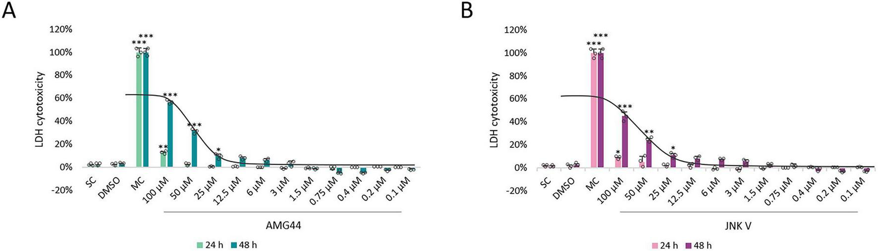 In accordance with the literature data and our previous experiments, we evaluated the potential cytotoxicity of the AMG44 and JNK V inhibitors in differentiated SH-SY5Y cells at concentration range of 100–0.1 μM and at 24 and 48 h incubation time. We previously performed XTT cell viability analysis for the tested compounds in differentiated SH-SY5Y cells, which demonstrated inhibition of cell proliferation at relatively high concentrations ( = 50 μM) and induction of cell proliferation by the inhibitors at lower concentrations, indicating a hormetic effect (Siwecka et al., 2024). Similarly, LDH test showed induction of cytotoxicity at = 25 μM at 48 h incubation and a slight reduction in extracellular lactate level induced by lower concentrations of both compounds, although insignificant. Therefore, the non-toxic low concentrations of the inhibitors ( = 12.5 μM) were chosen for further testing. The IC50 values for both compounds at 48 h of incubation were 80.5 μM for AMG44 and 122.2 μM for JNK V (Figure 2).