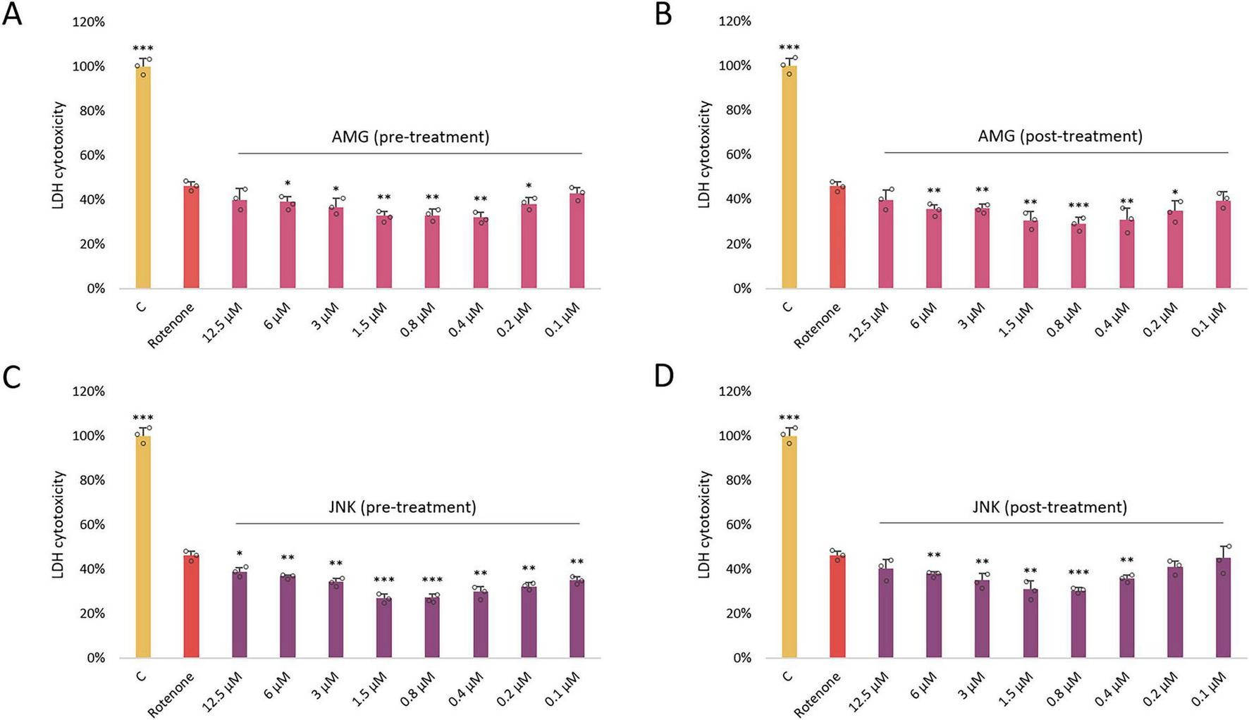 The effect of AMG44 pre-treatment (A) or post-treatment (B) and JNK V pre-treatment (C) or post-treatment (D) (1 h each) on cytotoxicity in differentiated SH-SY5Y cells incubated with the neurotoxin rotenone (ROT) at 12.5 μM for 48 h. The inhibitory compounds were tested at 12.5–0.1 μM concentration range. The cytotoxicity was evaluated by LDH assay. Data were analyzed by the one-way ANOVA with Bonferroni correction. Values are presented as mean ± SD (n = 3), *p < 0.05, **p < 0.01, ***p < 0.001 vs. ROT. C, Control, cells treated with 10X Lysis Buffer; AMG, cells treated with ROT (48 h) and AMG44 inhibitor (1 h); JNK, cells treated with ROT (48 h) and JNK V inhibitor (1 h).