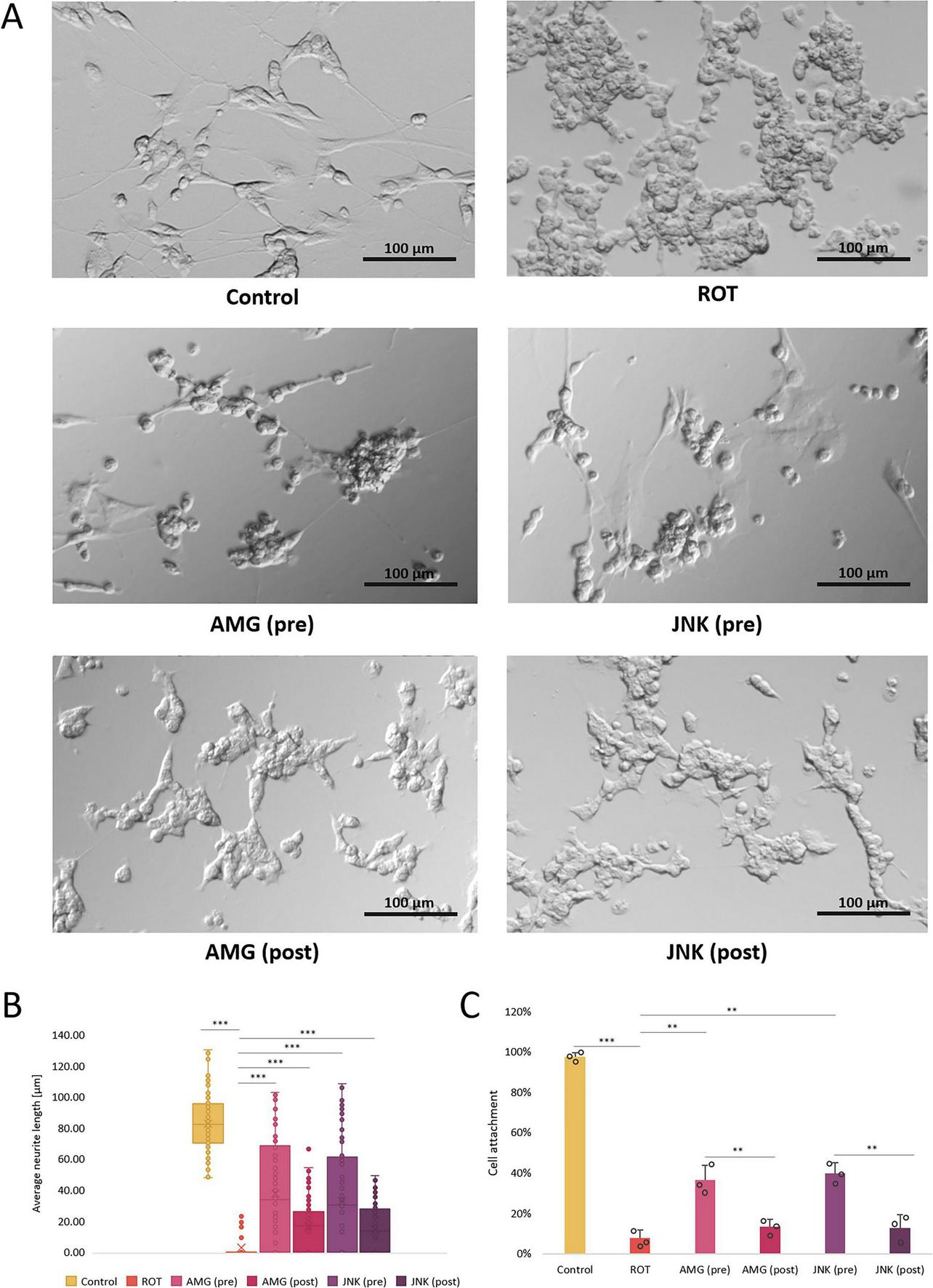 The morphological changes in differentiated SH-SY5Y cells incubated with rotenone (ROT) at 12.5 μM for 48 h and Unfolded Protein Response (UPR) inhibitors at their effective concentrations for 1 h; presented are representative pictures (A), quantitative assessment of the average neurite length (B) and cell attachment count (C). Control, untreated cells; ROT, cells treated with rotenone (48 h); AMG, cells treated with ROT (48 h) and AMG44 PERK inhibitor (1 h); JNK, cells treated with ROT (48 h) and JNK V inhibitor (1 h); pre, pre-treatment with the inhibitor; post, post-treatment with the inhibitor. Scale bar = 100 μm. Data were analyzed by the Kruskal-Wallis test with post-hoc Dunn’s test (B) or two-way ANOVA with Bonferroni correction (C). Values are presented as median and interquartile range (B) or mean ± SD (C) (n = 3), **p < 0.01, ***p < 0.001 for all groups.