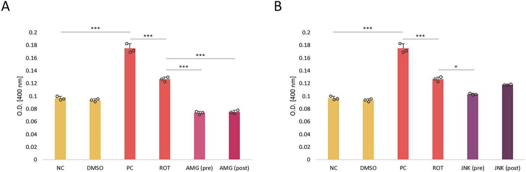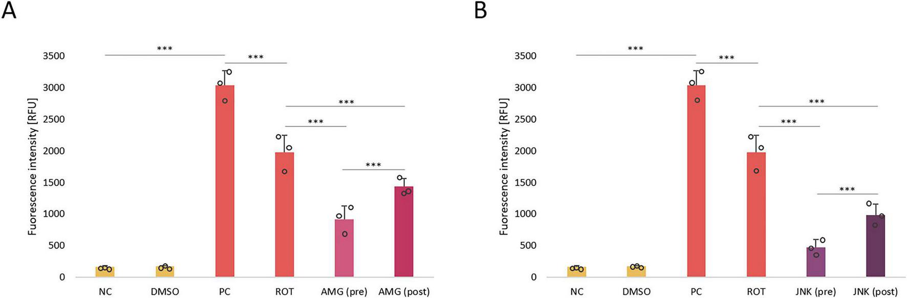 The analysis of reactive oxygen species (ROS) production in differentiated SH-SY5Y cells treated with rotenone (ROT) at 12.5 μM for 48 h and incubated with PERK inhibitor AMG44 (A) and JNK inhibitor JNK V (B) for 1 h at the effective concentrations. The ROS level was evaluated by the respective fluorometric assay. Data were analyzed by the two-way ANOVA with Bonferroni correction. Values are expressed as mean ± SD (n = 3), ***p < 0.001 for all groups. NC, Negative Control, untreated cells; DMSO, Solvent Control, cells treated with 0.1% dimethyl sulfoxide; PC, Positive Control, cells treated with 50 μM antimycin A (24 h); ROT, cells treated with rotenone (48 h); AMG, cells treated with ROT (48 h) and AMG44 inhibitor (1 h); JNK, cells treated with ROT (48 h) and JNK V inhibitor (1 h); (pre), pre-treatment with the inhibitor; (post), post-treatment with the inhibitor.