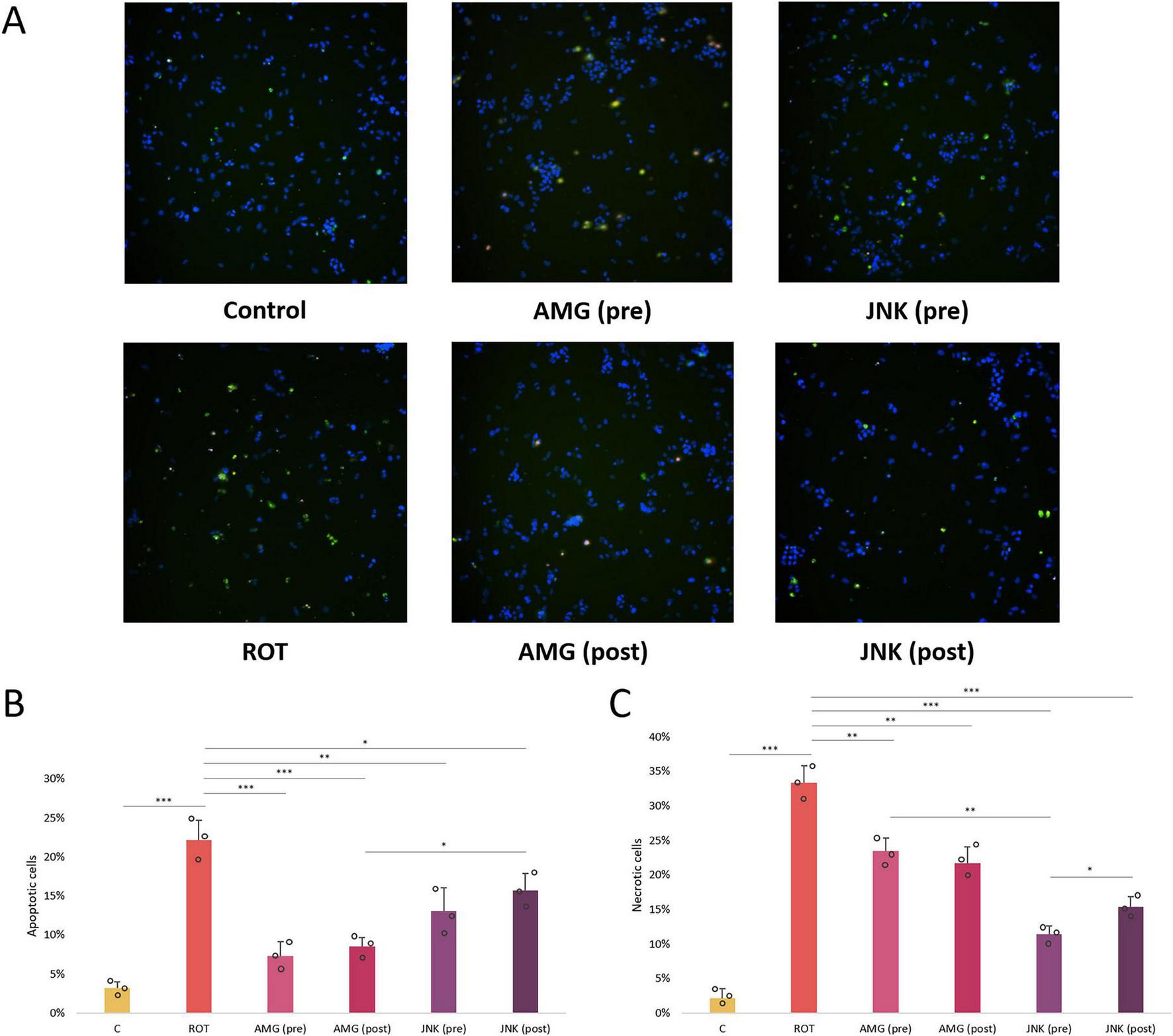 Microscopic images (A) and quantitative analysis (B,C) of the FITC-Annexin V (AV)/propidium iodide (PI) fluorescent staining of differentiated SH-SY5Y cells exposed to rotenone (ROT) at 12.5 μM for 48 h and UPR inhibitors at their effective concentrations for 1 h. The apoptotic AV-positive cells are characterized by green fluorescent signal, whereas the PI-positive dead cells present red fluorescent signal. The nuclei were counterstained with Hoechst (blue). The fluorescence was detected by the Nikon imaging system, and the intensity of FITC-AV/PI fluorescent signal was calculated. Data were analyzed by the two-way ANOVA with Bonferroni correction. Values are presented as mean ± SD (n = 3), *p < 0.05, **p < 0.01, ***p < 0.001 for all groups. Control, untreated cells; ROT, cells treated with rotenone (48 h); AMG, cells treated with ROT (48 h) and AMG44 inhibitor (1 h); JNK, cells treated with ROT (48 h) and JNK V inhibitor (1 h); (pre), pre-treatment with the inhibitor; (post), post-treatment with the inhibitor.