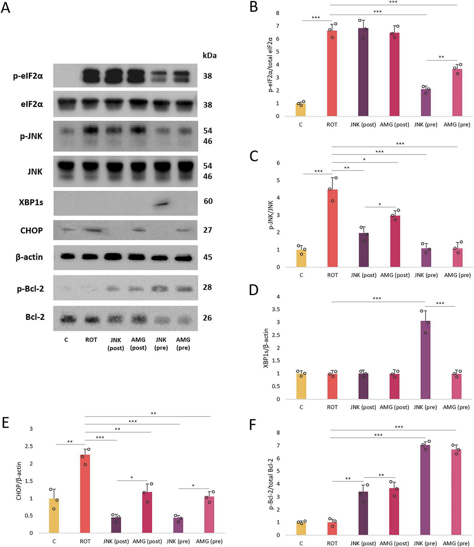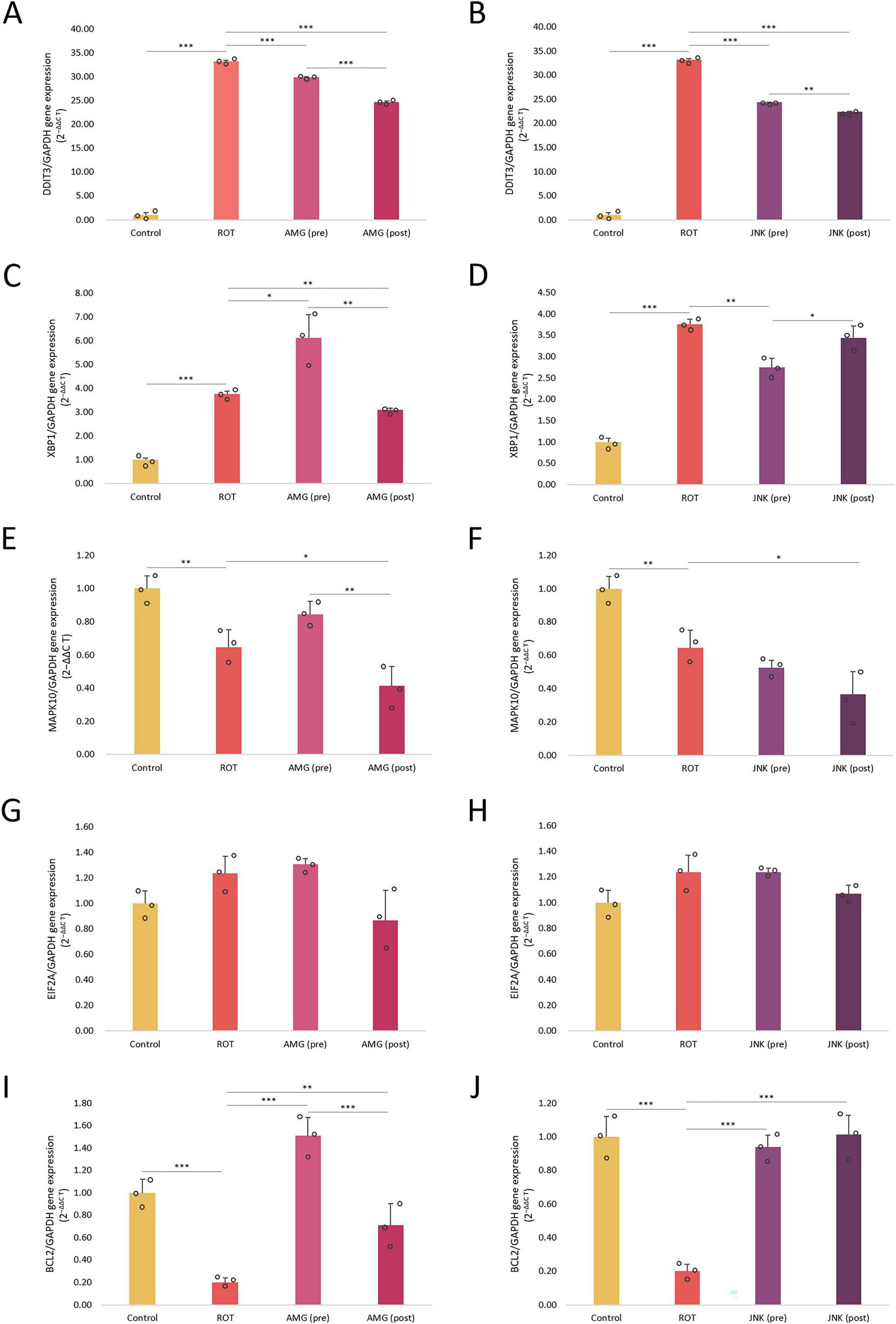 The mRNA expression levels of endoplasmic reticulum (ER) stress- and apoptosis-related genes DDIT3(A,B), XBP1(C,D), MAPK10(E,F), EIF2A(G,H), and BCL2(I,J) in differentiated SH-SY5Y cells exposed to rotenone (ROT) at 12.5 μM for 48 h and AMG44 (A,C,E,G,I) or JNK V (B,D,F,H,J) inhibitors at their effective concentrations for 1 h. GAPDH was used as a reference gene. Data were analyzed by the two-way ANOVA with Bonferroni correction. Values are presented as mean ± SD (n = 3), *p < 0.05, **p < 0.01, ***p < 0.001 for all groups. Control, untreated cells; ROT, cells treated with rotenone (48 h); AMG, cells treated with ROT (48 h) and AMG44 inhibitor (1 h); JNK, cells treated with ROT (48 h) and JNK V inhibitor (1 h); (pre), pre-treatment with the inhibitor; (post), post-treatment with the inhibitor.