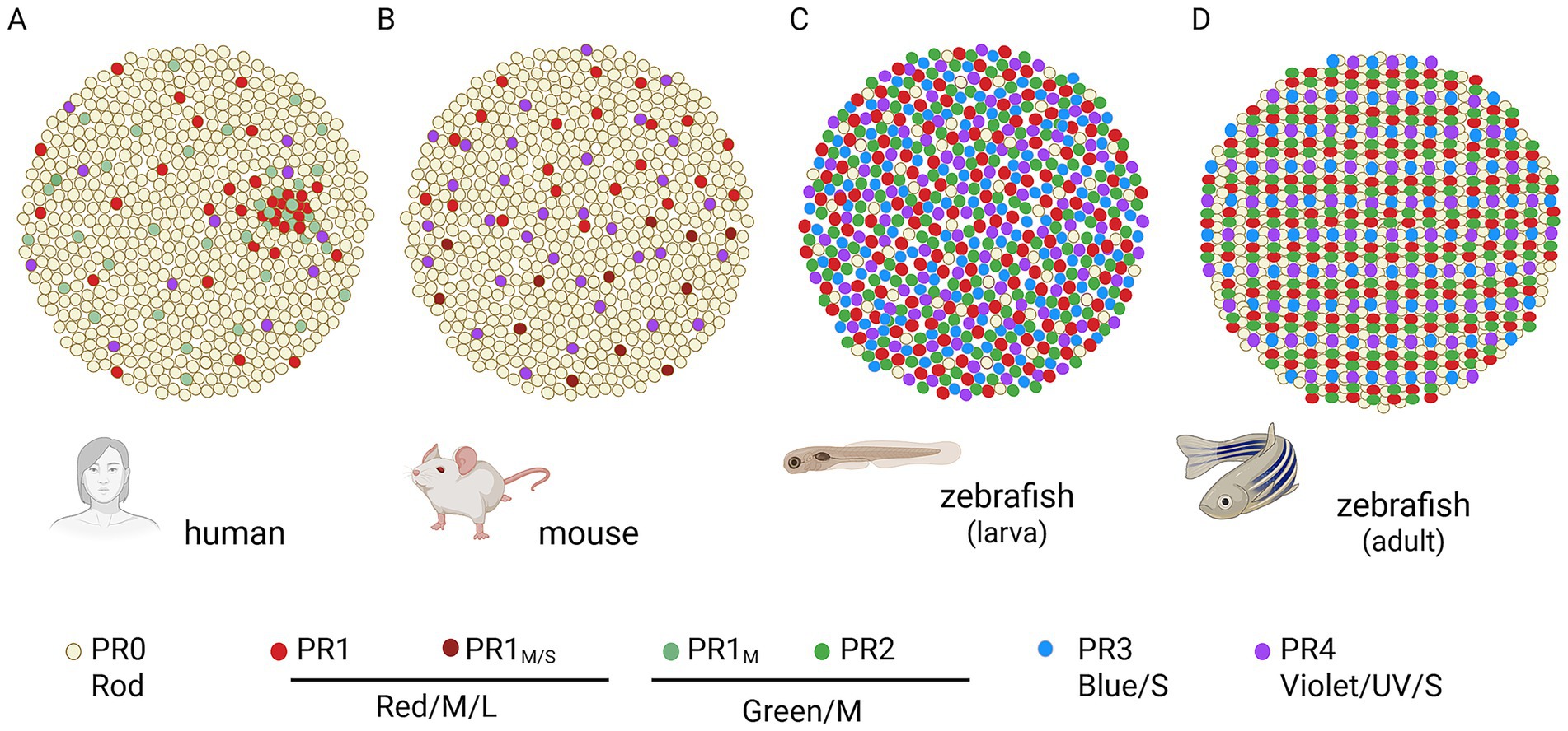 Figure 1. Photoreceptor mosaic organization in the human (A), mouse (B), and zebrafish (C,D) retina. The human retina is known to be trichomatic and rod-dominant with the macula and in the very center the fovea that has cone-only structure (Hofer et al., 2005). Mouse retina is dichromatic rod dominant that lacks macula but there is a central area that has a higher ratio of cones-to-rods (Applebury et al., 2000). Zebrafish has tetrachromatic vision and two distinct mosaic patterns: the larval one that has very few non-responsive rods and the recordings come from cones-only and the juvenile/adult mosaic that has physiologically responsive rods but is still cone dominant (Allison et al., 2010). Updated photoreceptor nomenclature of Baden et al. is used that is based on the physiological and molecular identity of the neurons and not the spectral properties of their opsins (Baden et al., 2025). Image created in BioRender.
