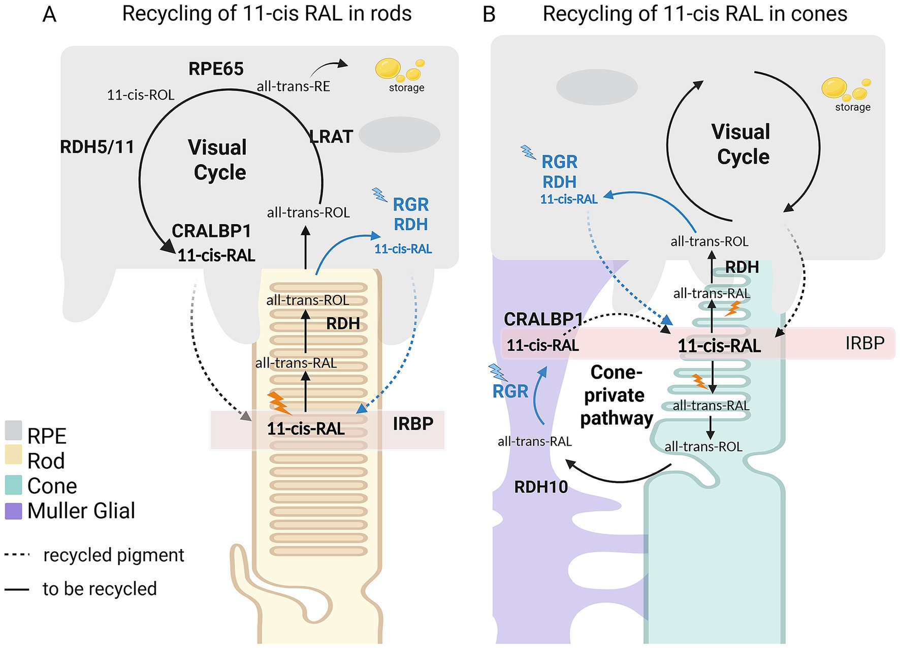 Figure 2. Model for recycling of 11-cis retinal (RAL) for rods (A) and cones (B) in vertebrates. (A) The RPE-mediated visual cycle provides both rods (yellow) and cones (green) with recycled 11-cis-RAL (in dashed arrows). Upon excitation 11-cis-RAL is photoconverted to all-trans RAL that is converted by an all-trans retinol dehydrogenase 8 or 12 (RDH8/12)to all-trans ROL that is then shuttled to the RPE (in grey) and is subsequently converted to all-trans retinylesters (REs) by lecithin retinol acyltransferase LRAT. These all-trans REs are either stored in lipid droplets or isomerized by RPE65 to 11-cis-ROL and finally converted to 11-cis-RAL by another cis retinol dehydrogenase 5 or 11 (RDH5/11). 11-cis-RAL binds to CRALBP1 to prevent photodegradation and is supplemented at any time to the photoreceptor outer segments. Assisted transportation retinoids between the RPE and the photoreceptors is mediated by the IRBP. Additionally, RGR re-isomerizes all-trans-ROL in the RPE by absorbing blue light, independent of the visual cycle. (B) Cone photoreceptors have an additional pathway mediated by Müller Glia cells (in purple) with some still unidentified components. Among the identified proteins are RGR photoisomerase, CRALBP1 retinoid binding protein, RDH10 dehydrogenase, nonetheless the precise steps are not defined. Image created in BioRender.