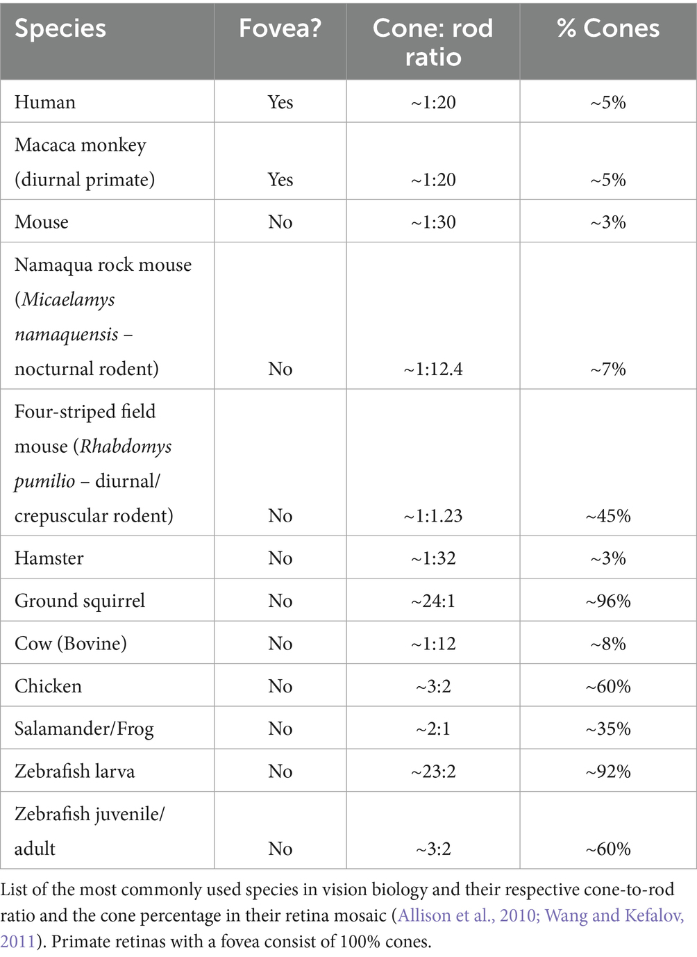 Light conditions, visual ecology and species-specific behavior influence the way that rods and cones recycle their visual pigments (Albalat, 2012; Guido et al., 2022; Hagen et al., 2023; Hankins et al., 2014; Musilova et al., 2021). Given the differences in retinal mosaics among zebrafish, mice, and humans (Figure 1), as well as variations in their rod-to-cone ratios (Table 1), the interplay between the canonical visual cycle and the cone-specific retinoid pathway is likely to differ substantially across species. Consequently, several models describing these mechanisms have been revised over the past decade. A prominent example illustrating the importance of species-specific context is the debated role of RGR (Morshedian et al., 2019; Radu et al., 2008; Tworak et al., 2023; Wenzel et al., 2005; Zhang et al., 2019).