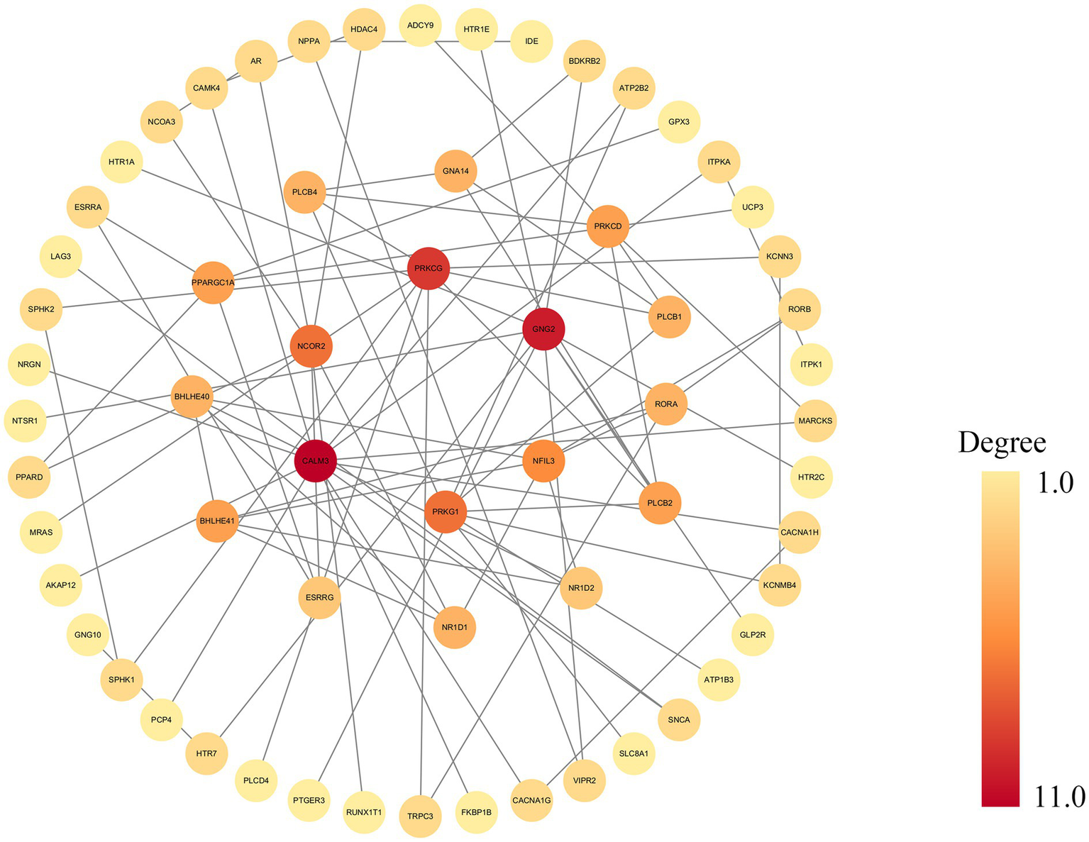 To identify key regulatory genes and their interaction landscape, a statistically significant PPI network was constructed from the differentially expressed genes, comprising nodes and edges. The network’s visualization in Cytoscape (Figure 5) demonstrates a clear core-periphery architecture, which is strong evidence of its non-random organization. Topological analysis using degree centrality revealed a densely interconnected central module of 10 hub genes. Among these, CALM3 and GNG2 emerged as the most prominent hubs, distinguished by their central position and highest number of interactions. They were closely associated with a second tier of key hubs, including PRKCG, PRKG1, NCOR2, NFIL3, NR1D1, NR1D2, BHLHE40, and BHLHE41. Collectively, these 10 genes form the functional core of the network, interacting extensively with each other and with numerous peripheral proteins.