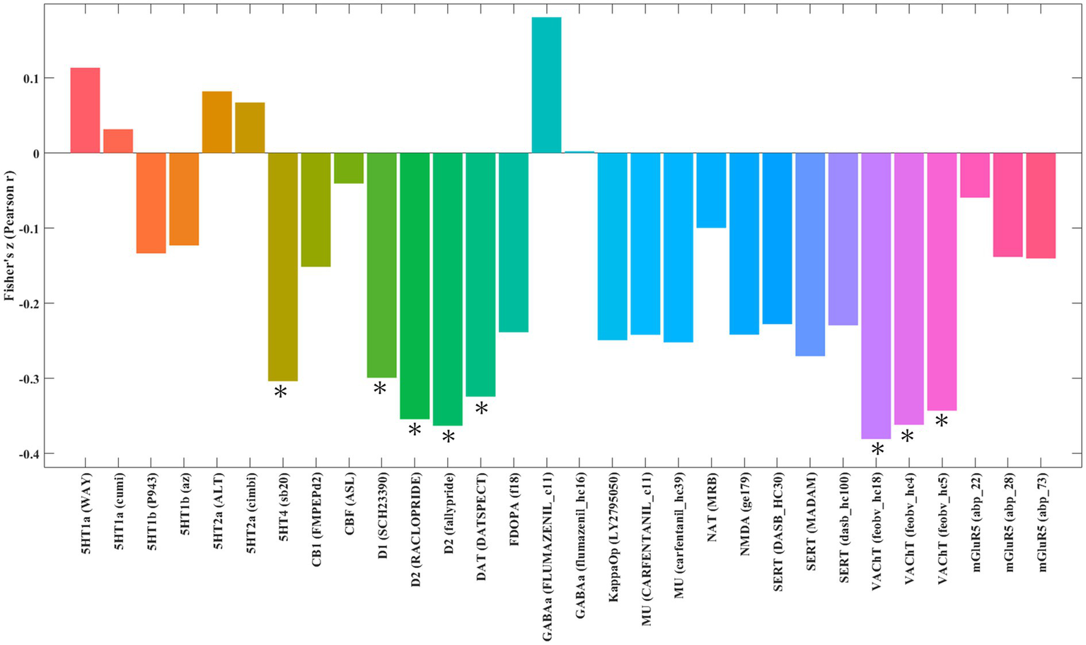 Spatial correlation between gray matter alterations in patients with juvenile myoclonic epilepsy and neurotransmitter system maps. The figure displays brain regions where the statistical map of gray matter alterations in juvenile myoclonic epilepsy shows significant spatial correlation with predefined maps of neurotransmitter distributions. *Indicates significant correlation at p < 0.01, *Indicates significant correlation at p < 0.01, corrected for multiple comparisons using the FDR method. 5HT1a, serotonin 1A receptor; 5HT1b, serotonin 1B receptor; 5HT2a, serotonin 2A receptor; 5HT4, serotonin 4 receptor; CB1, cannabinoid receptor 1; CBF (ASL), cerebral blood flow (arterial spin labeling); D1, dopamine receptor D1; D2, dopamine receptor D2; DAT, dopamine transporter; FDOPA, fluorodopa; FDR, false discovery rate; GABAa, gamma-aminobutyric acid A receptor; KappaOp, kappa opioid receptor; MU, mu-opioid receptor; NAT, norepinephrine transporter; NMDA, N-methyl-D-aspartate receptor; SERT, serotonin transporter; VAChT, vesicular acetylcholine transporter; mGluR5, metabotropic glutamate receptor 5.