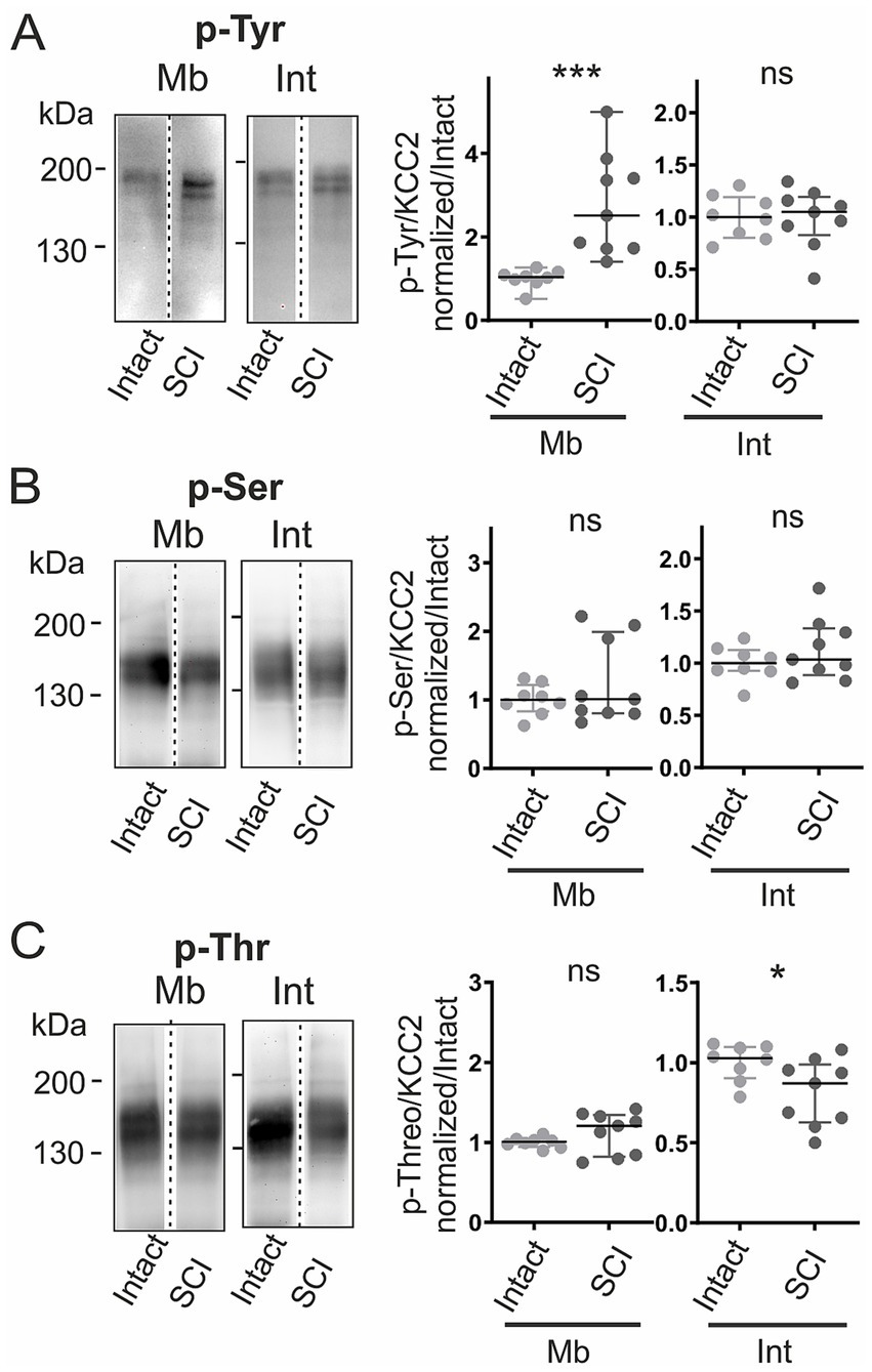 For phosphorylation analysis, phosphorylation levels were calculated as the ratio of signal intensity obtained with phospho-specific antibodies (anti-phosphoserine, anti-phosphothreonine, or anti-phosphotyrosine) to the signal intensity of the total KCC2 monomeric form (130–140 kDa) within the same subcellular fraction. Relative phosphorylation levels were then normalized to the corresponding control group as described above. It is important to note that the analysis relied on pan-specific antibodies targeting total phosphotyrosine, phosphoserine, or phosphothreonine residues. Consequently, the signals quantified here reflect the global phosphorylation state of the KCC2 protein and do not allow for the identification of specific phosphorylated amino acid residues.