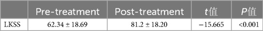 From Table 1 we know that: (1) Comparison of the efficacy evaluation of patients' LKSS scores before and after treatment, the data of the two groups conform to the normal distribution, and the comparison is made using the paired samples t-test; the results show that the t-value = −15.665, P < 0.001, then P < 0.05, the difference is statistically significant (P < 0.05). (2) The patient's LKSS score (62.34 ± 18.69) before treatment and (81.2 ± 18.20) after LKSS treatment, the LKSS score scores improved, suggesting that PRP treatment of KTOA can improve knee joint function.