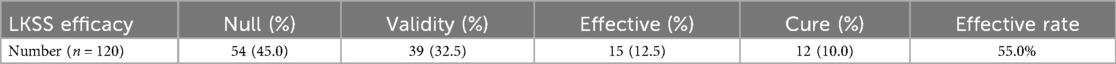 From Table 2, we know that: of the 120 patients, 54 patients, or 45.0%, had ineffective LKSS scores; 39 patients, or 32.5%, had effective LKSS scores; 15 patients, or 12.5%, had effective LKSS scores; and 10 patients, or 10.0%, had cured LKSS scores. The total effective rate was 55.0%.