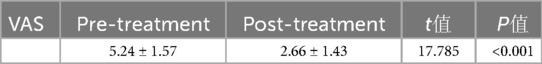 From Table 3 we know that: (1) Comparison of patients' efficacy evaluation before and after VAS treatment, the data of the two groups conform to the normal distribution, and the comparison is made by the paired samples t-test; the results show that the t-value = 17.785, P < 0.001, then P < 0.05, and the difference is statistically significant (P < 0.05). (2) The patients' VAS score (5.24 ± 1.57) before treatment, and VAS score (2.66 ± 1.43) after treatment, the VAS score scores decreased, suggesting that PRP treatment of KTOA can improve pain symptoms.