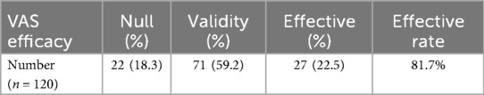 From Table 4, we know that: of the 120 patients, 22 patients, or 18.3%, had ineffective VAS efficacy; 71 patients, or 59.2%, had effective VAS efficacy; and 27 patients, or 22.5%, had significant VAS efficacy. The total effective rate was 81.7%.