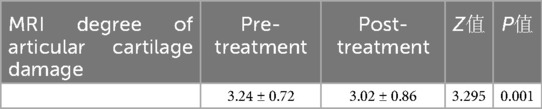 From Table 5 we know that: (1) the efficacy evaluation of the degree of MRI articular cartilage damage before and after the treatment of patients, the data of the two groups do not conform to normal distribution, and the comparison between before and after the treatment is made by Wilcoxon rank sum test; the results show that the Z-value = 3.295, P < 0.001, then P < 0.05, the difference is statistically significant (P < 0.05). (2) The patients' MRI articular cartilage damage degree score (3.24 ± 0.72) before treatment, and MRI articular cartilage damage degree score (3.02 ± 0.86) after treatment, the MRI articular cartilage damage degree score decreased, suggesting that PRP treatment of KTOA can promote cartilage damage repair.