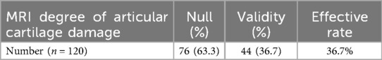 From Table 6, we know that: among 120 patients, 76 patients whose efficacy of MRI articular cartilage damage degree score was invalid, accounting for 63.3%; 44 patients whose efficacy of MRI articular cartilage damage degree score was effective, accounting for 36.7%. The total effective rate was 36.7%.