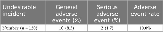 From Table 7, we know that: out of 120 patients, 10 patients (8.3%) had general adverse events and 2 patients (1.7%) had serious adverse events. The incidence of adverse events was 10.0%.