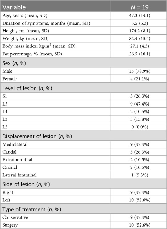 We prospectively recruited patients with LDHR with or without radicular pain diagnosed by a neurosurgeon during consultations at the Cantonal Hospital of Graubuenden between October 2018 and December 2019 for this observational study. Physical assessment was done to diagnose LR; an MRI was performed to confirm the presence of an LDH, the direction of displacement, and the corresponding lesion level. All patients included in this study received physiotherapy at the Cantonal Hospital Graubünden, regardless of whether they had undergone surgery beforehand. Physiotherapists were instructed to apply standard physiotherapy methods such as manual therapy, mobilization, and exercise therapy. A treatment protocol was completed by the physiotherapists; however, individual treatment sessions were not further analyzed in this study, as the primary aim was to investigate the progression of outcome measures independent of the specific treatment provided. Patients who did not understand or speak German were excluded from the study. Participation in the study did not interfere with the patient's regular physiotherapeutic and medical treatment. The study was approved by the local ethics committee of Zurich, Switzerland (BASEC no.: 2018-00637). All participants signed a written study information and informed consent form.