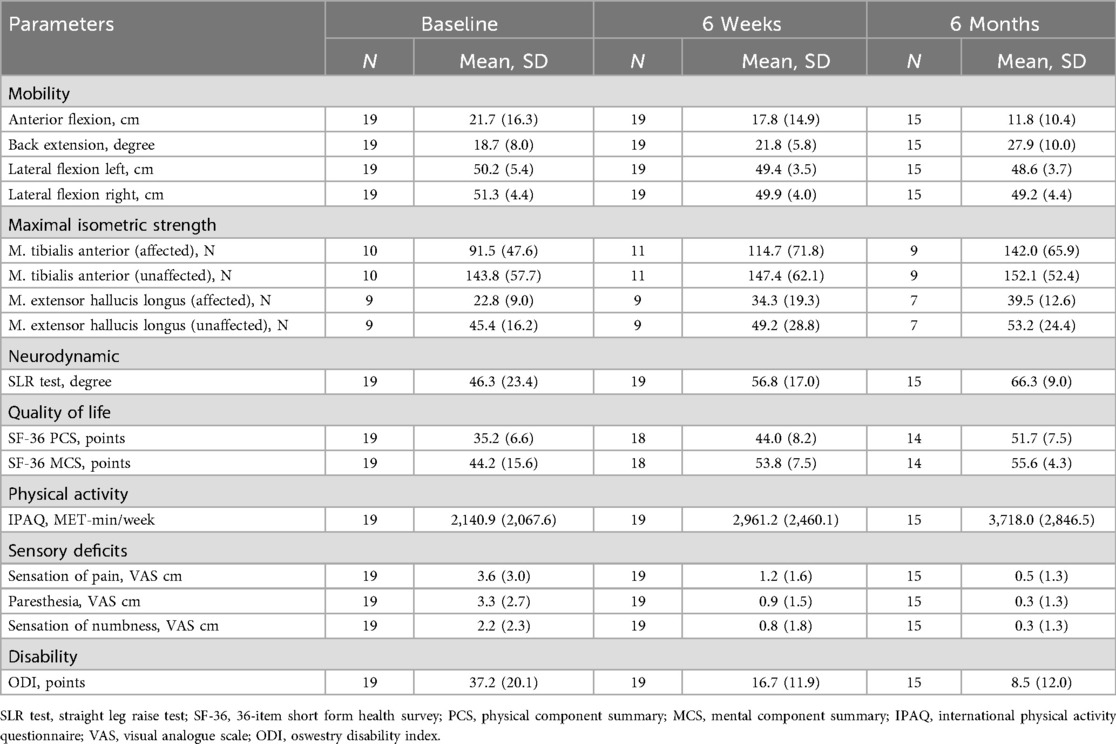 Results: At six weeks (n = 19), significant improvements were observed in the straight-leg raising test (mean difference: 10.53, 95% CI: 1.25–19.81, p = 0.02), the Short Form-36 Health Survey physical component score (9.06, 95% CI: 4.23–13.90, p < 0.001), and the mental component score (10.29, 95% CI: 4.81–15.76, p < 0.001), pain sensation (−2.46, 95% CI: −3.99–−0.93, p < 0.001), paresthesia (−2.36, 95% CI: −3.73–−0.99, p < 0.001), numbness (−1.35, 95% CI: −2.56–−0.14, p = 0.023), and in the Oswestry Disability Index score (−20.42, 95% CI: −28.04–−12.80, p < 0.001). At six months (n = 15), significant benefits were noted in anterior flexion (−8.19, 95% CI: −13.42–−2.96, p = 0.001), back extension (9.35, 95% CI: 4.52–14.18, p < 0.001), and muscle strength in the affected leg (tibialis anterior muscle: 44.27, 95% CI: 4.72–83.81, p = 0.024; extensor hallucis longus muscle: 16.58, 95% CI: 2.60–30.56, p = 0.02). No significant changes occurred in lateral flexion left or right, strength in the unaffected leg, or the International Physical Activity Questionnaire.