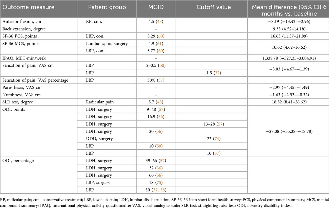 All subjective PROMs investigated in this study, showed significant improvement as early as six weeks after treatment initiation, with the exception of the IPAQ. In contrast, most objective physical assessment parameters demonstrated notable improvements only after six months of treatment. No improvements were observed in lateral flexion. However, more important than statistical significance is the clinical relevance of the treatment-related improvement (34). In this study, the observed effect sizes were notably large, particularly for the ODI and SF-36 PCS, indicating a potentially clinically meaningful benefit. To interpret the clinical relevance of these changes, the minimum clinically important differences (MCIDs) reported in previous studies can serve as a useful benchmark. However, MCIDs can vary depending on the methodology used for their calculation, the timing of follow-up assessments, and the characteristics of the study population (35). Therefore, applying generic MCIDs across different pathologies is not recommended (36). Nevertheless, MCIDs specific to LDHR, particularly in conservatively treated patients, are lacking. In such cases, insights can be drawn from studies involving surgically treated LDH patients or broader low back pain populations (Table 4). A consensus group of experts has proposed MCID for pain and functional status in patients with low back pain, offering guidance in interpreting the mean differences observed in this study (37).