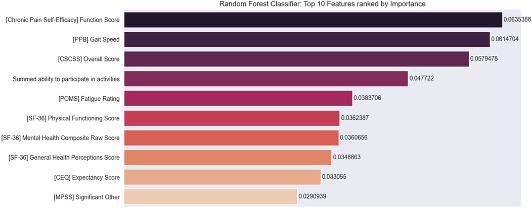 Figure 1. Top 10 features for predicting binary response to intervention. Chronic Pain Self-Efficacy (CPSE) function score; PPB (Short Physical Performance Battery) gait speed score; CSCSS (Catastrophizing Scale of the Cognitive Strategies Questionnaire) overall score; summed ability to participate in activities; POMS (Profile of Mood States) fatigue rating score; SF 36 (Short-Form Health Survey) physical functioning score; mental health composite score, and general health perception score; CEQ (Credibility Expectancy Questionnaire) expectancy score; and MPSS (Multidimensional Scale of Perceived Social Support) significant other score.