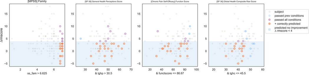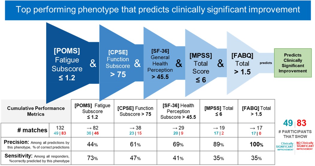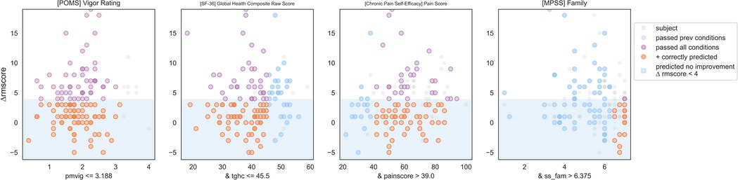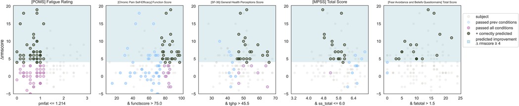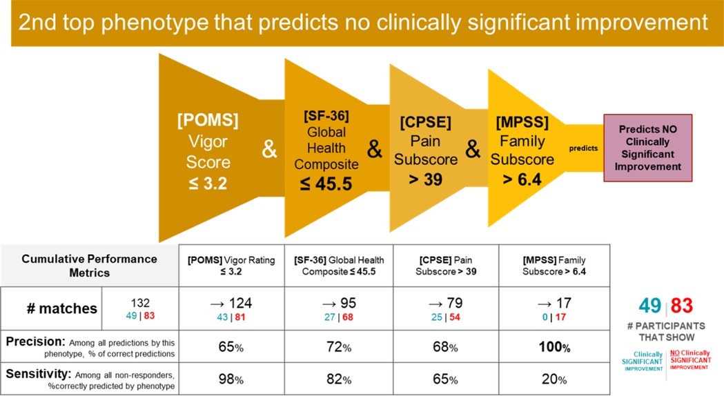 IF ([POMS Profile of Mood States] Fatigue Subscore) ≤ 1.2 and ([CPSE Chronic Pain Self-Efficacy] Function Subscore) > 75 and ([SF-36 Quality of Life] General Health Perception Subscore)> 45.5 and ([MPSS Multidimensional Scale of Perceived Social Support] Total Score) ≤ 6 and ([FABQ Fear Avoidance and Beliefs Questionnaire] Total Score) > 1.5 THEN predict clinically significant improvement (see Figures 2, 3).