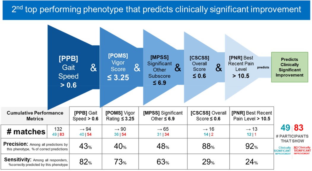 IF ([PPB Short Physical Performance Battery] Gait Speed) > 0.6 and ([POMS Profile of Mood States] Vigor Score) ≤ 3.25 and ([MPSS Multidimensional Scale of Perceived Social Support] Significant Other score) ≤ 6.9 and ([CSCSS Catastrophizing Scale of the Cognitive Strategies Questionnaire] Overall Score) ≤ 0.6 and ([PNRS Pain Numeric Rating] Best Recent Pain Level) > 10.5 THEN predict clinically significant improvement (see Figures 4, 5).