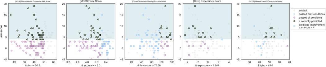 IF ([SF-36 Quality of Life] Mental Health Composite Raw Score) ≤ 50.5 and ([MPSS Multidimensional Scale of Perceived Social Support] Total Score) ≤ 6 and ([CPSE Chronic Pain Self-Efficacy] Function Score) > 75.6 and ([CEQ Credibility Expectancy Questionnaire] Credibility Expectancy Score) ≤ 1.6 and ([SF-36 Quality of Life] General Health Perception Subscore)> 45 THEN predict clinically significant improvement (see Figures 6, 7).