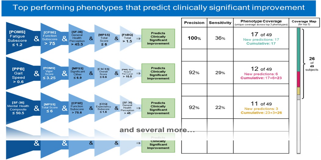 where “set of conditions” consists of one or more conditions on participant features (e.g., Gait Speed > 0.6); and the response prediction is either “yes” (i.e., clinically significant response to treatment) or “no” (i.e., no clinically significant response to treatment). The order in which these conditions appear in the phenotype corresponds to the predictive importance of the conditions, with the first condition being the most important in the prediction.