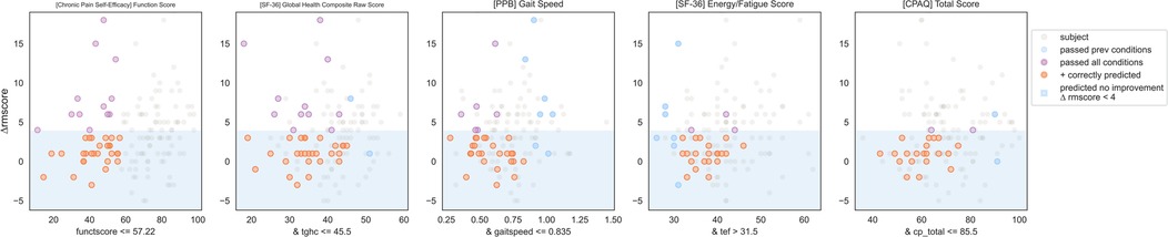 Figure 4. Responder phenotype 2 scatter plots. Each scatter plot corresponds to one phenotype condition and depicts the phenotype condition values on the x-axis vs. the outcome (ΔRMscore) values on the y-axis. Scatter plots are presented in the same order of condition importance within a phenotype from left to right. Data points represent all intervention participants in the dataset.