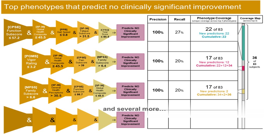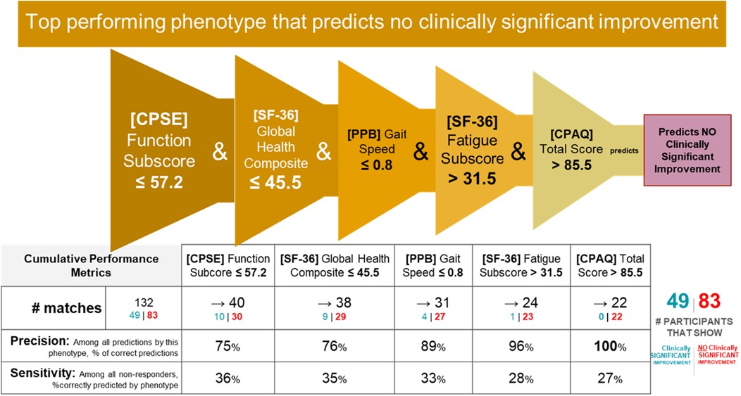 Each IF-THEN phenotype makes only one type of prediction, either “yes” (i.e., clinically significant response) or “no” (i.e., not clinically significant response) for all the participants who satisfy the set of conditions in the phenotype. For example, the fake rule: IF Gait Speed > 0.6 THEN predict clinically significant improvement predicts clinically significant improvement for all participants whose gait speed is greater than 0.6, but it remains silent about the outcome of participants with gait speed ≤ 0.6. Hence, metrics such as accuracy, area under the Receiver Operating Characteristic (ROC) curve, AUC, and specificity are not appropriate to measure the predictive performance of an IF-THEN phenotype. We consider instead two performance metrics, precision and recall, that best describe the predictive performance of these phenotypes: