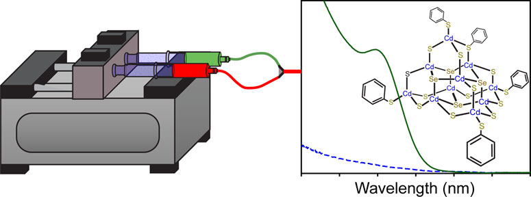 In most preparations some time would elapse before the clusters were fully dissolved in DMF. As a result we attribute the issues with the observation of a consistent 1:1 QD to catalyst ratio to the cluster’s propensity to aggregate before injection into the flow system. In the future, we hope to minimize this by enhancing the cluster solubility, perhaps through variation of the counterion. And while these results may tempt the employment of clusters with greater stability, this may be counterproductive as we hypothesize that ligand displacement of a ligand, or perhaps via the loss of the apical [Cd(SPh)3]–, is essential to the cluster seeding process; further investigations will examine this potential.