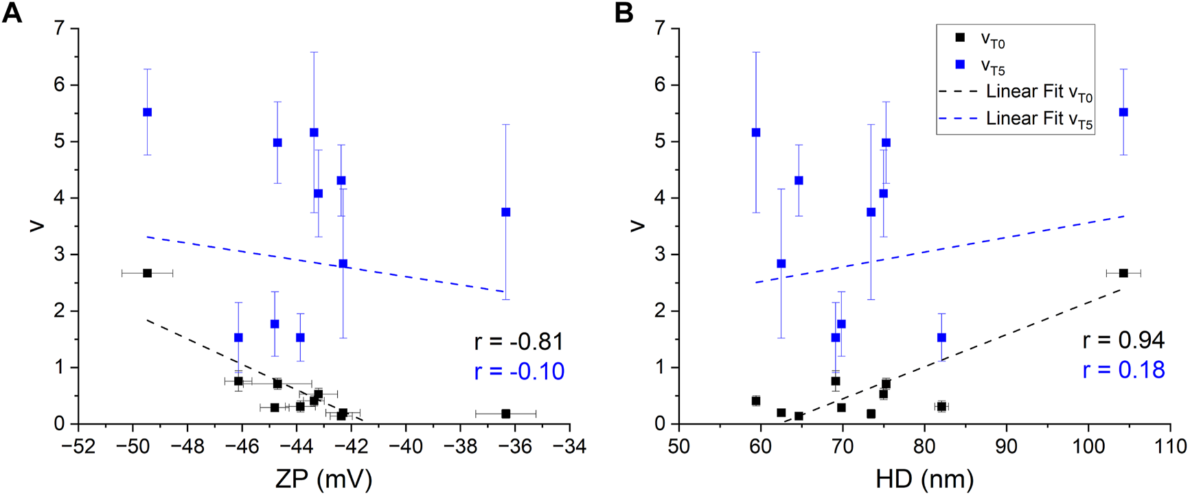 Correlation of the chemical-physical parameters of the particles with the binding rate (v) on the T0 (hydrophobic) and the T5 (positively charged) collectors. Mean values of charge as (A) ZP and size as (B) HD were used. r indicates the Pearson’s coefficient of linear correlation.