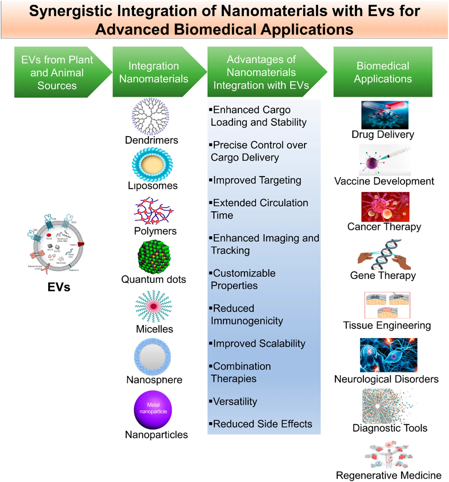 Extracellular vesicles (EVs) are gaining considerable attention in advanced biomedical applications due to their pivotal role in intercellular communication. EVs are naturally occurring nanoscale vesicles, secreted by various cell types and provide a unique platform for transporting bioactive cargo, such as proteins, nucleic acids, and lipids, across biological barriers (Song et al., 2022). However, realizing the full therapeutic potential of EVs presents challenges like limited cargo capacity, rapid clearance from circulation, and difficulties in achieving targeted delivery. This is where nanomaterials come into play a versatile class of engineered nanoparticles and structures at the nanoscale, designed with specific properties and functions (Xu M. et al., 2023). Integrating nanomaterials with EVs forms a synergistic partnership that offers promising solutions to these challenges, unlocking advanced possibilities in biomedical applications (Tian et al., 2022).