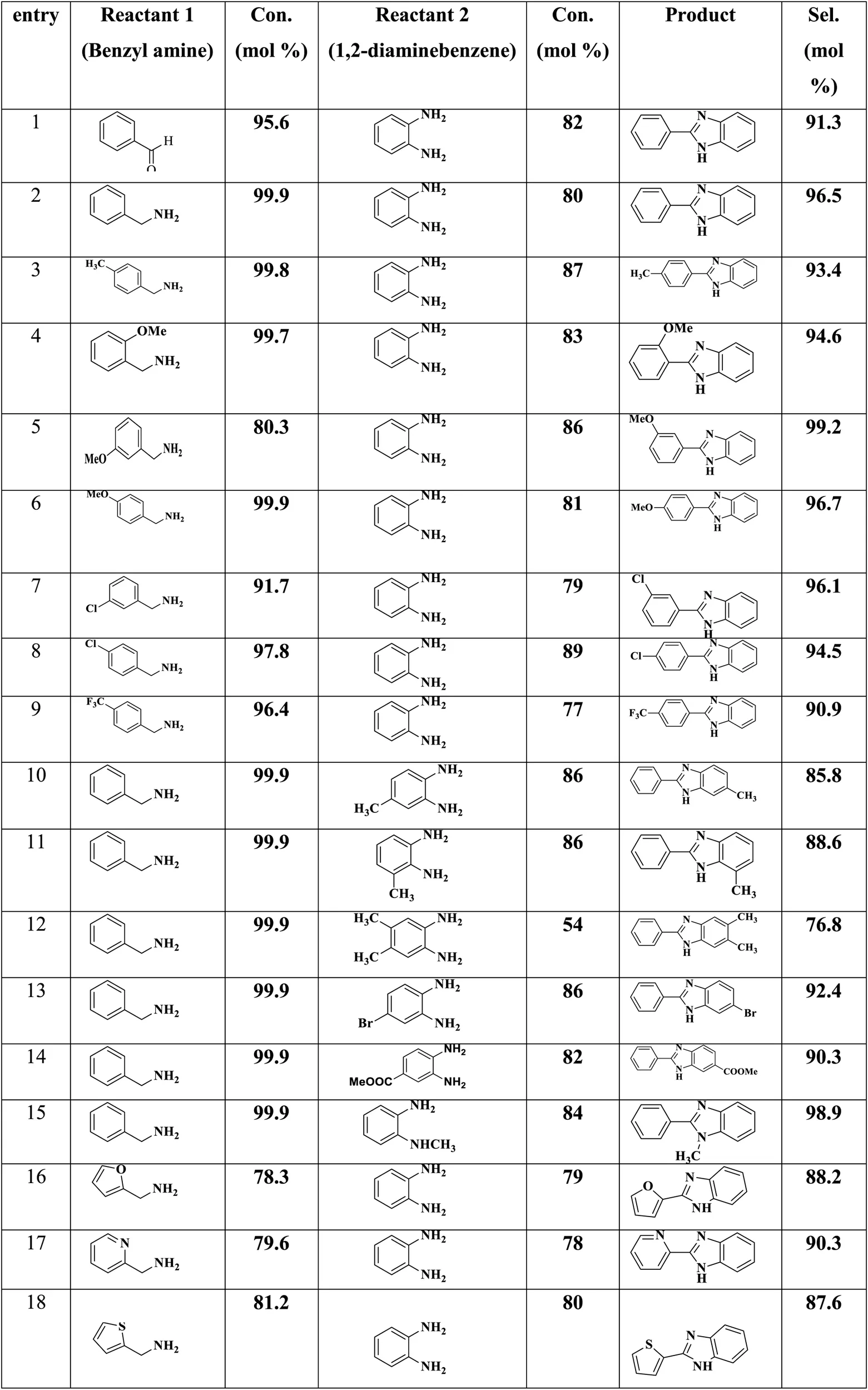 Synthesis of benzimidazole from various benzyl amine and 1,2-diaminobenzene derivatives.