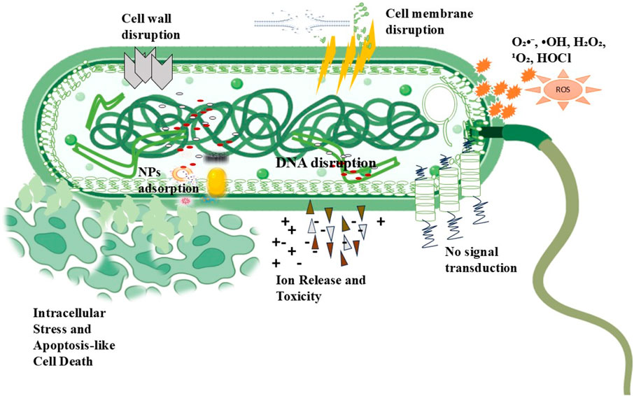 NPs interact with the bacterial cell’s basic components, such as DNA, lysosomes, ribosomes, and enzymes, leading to oxidative stress, heterogeneous alterations, changes in cell membrane permeability, electrolyte balance disorders, enzyme inhibition, protein deactivation, and changes in gene expression (Shrivastava et al., 2007; Yang et al., 2009; Xu et al., 2016). Figure 1 represent the mechanism of action of NPs against microbes.