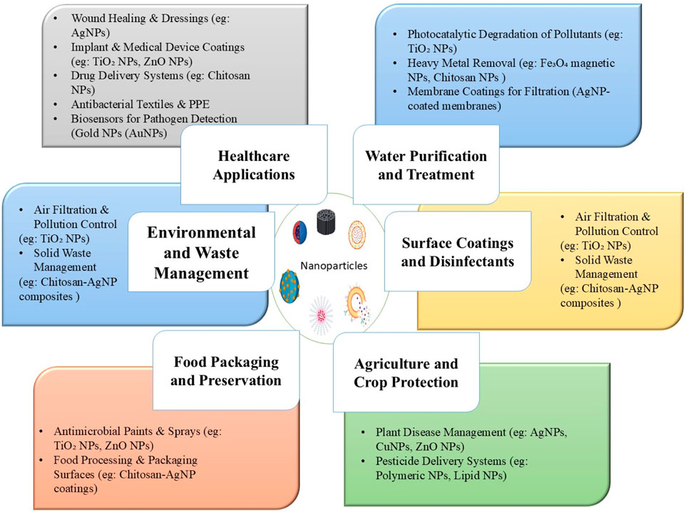 Figure 2. Diagrammatic illustration of the applications of antibacterial NPs: from healthcare to Agriculture, Enhancing Safety and Sustainability.