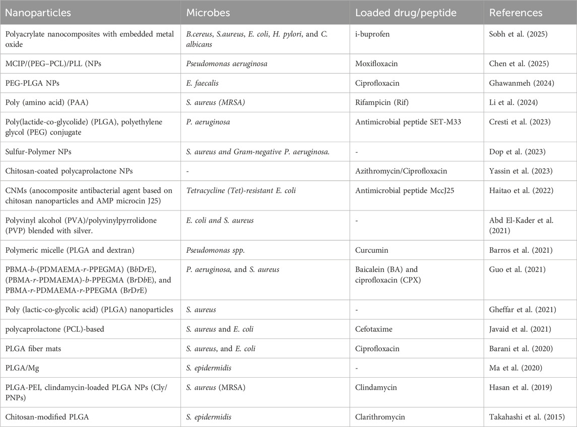 Table 1. Represents the examples of antibacterial activity of polymeric nanoparticles (NPs) loaded with various peptide-based drugs, as well as intrinsic antimicrobial activity exhibited by unloaded polymeric NPs.