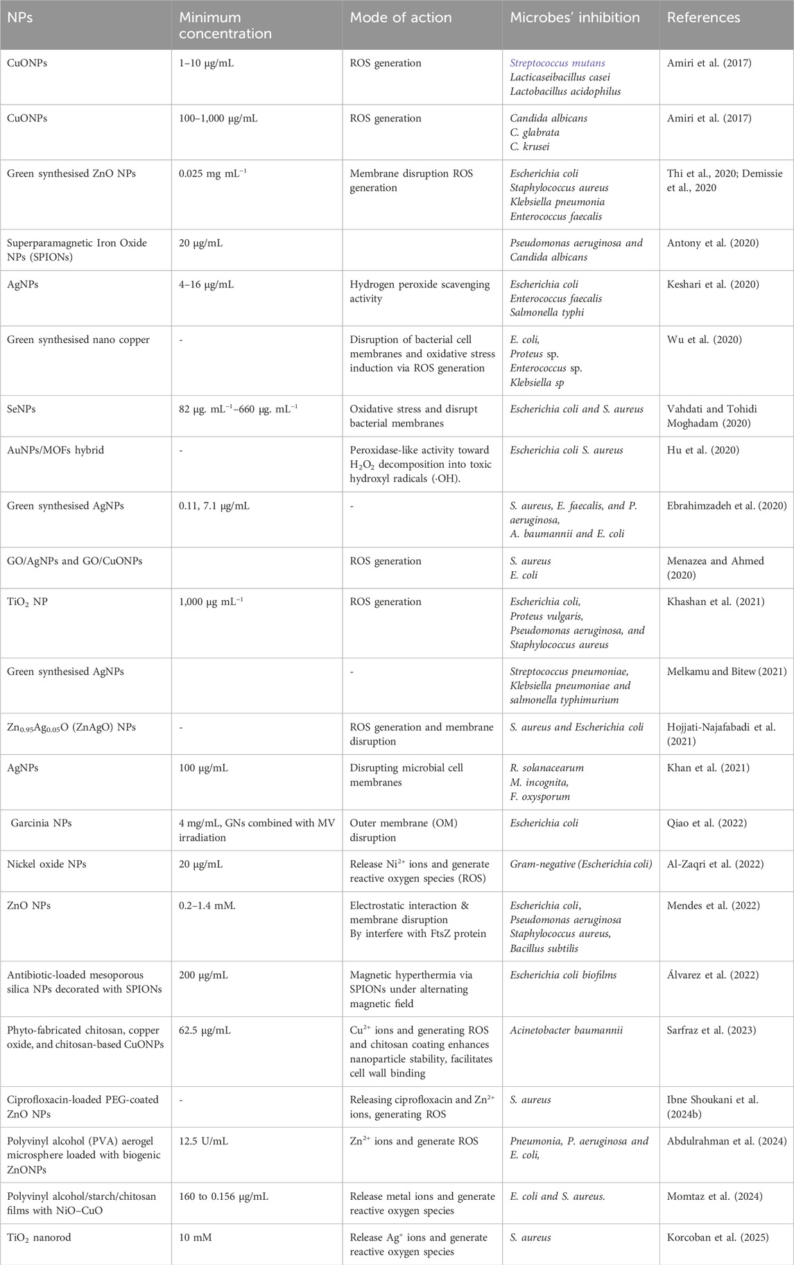 Researchers are focusing on developing novel materials from sustainable and biorenewable sources to address environmental concerns and depletion of fossil resources. Nanocomposites, made from biorenewable resources, offer benefits like high mechanical characteristics, thermal stability, and ease of production, benefiting various industries like food, biomedicine, and automotive (Ates et al., 2020). Increasing research on nanocomposite significantly focus on creating eco-friendly, nontoxic, biocompatible, and biobased fillers and composites. These materials are used in biosensors and biomedicine, particularly in microbiology as antibacterial agents (Warangkar et al., 2022). A study fabricated nanocomposites combining reduced graphene oxide (RGO) with metal oxides like silver oxide (AgO), nickel oxide (NiO), and zinc oxide (ZnO). The materials showed strong antibacterial and antifungal activities against pathogens like Staphylococcus aureus, Escherichia coli, and Candida albicans, with antibiofilm inhibition exceeding 90%. The nanocomposites also disrupted bacterial cell membranes, leading to cell death, highlighting their potential in combating resistant microbial strains (Elbasuney et al., 2023). Abd El-Fattah study presents an eco-friendly method for creating a multifunctional smart nanobiocomposite (NBC) made from ZnO, PIACSB, and TiO2. The NBC was created by converting shrimp shells into polyimidazolium amphiphilic chitosan Schiff base (PIACSB), which was then used as an encapsulating and coating agent. The NBC demonstrated remarkable antimicrobial activity against Staphylococcus aureus, Escherichia coli, and Pseudomonas aeruginosa, and superior antibiofilm activity against ciprofloxacin (Abd El-Fattah et al., 2023). Nanocomposite can also be use to treat heavy metal pollution for instance Shewanella onesidensis metabolism is used to create bio-ZnS/CuS composites, which have broad-spectrum antibacterial properties and high visible light-driven photocatalytic activity. More than 95% of the heavy metal ions in wastewater are effectively recovered by the composites. Superior photocatalytic activity was revealed by the composite with a 1:9 Zn to Cu ratio, which achieved sterilisation rates of over 99.99% against Escherichia coli and 99.98% against Staphylococcus aureus (Ma et al., 2023). Various nanocomposite are used for environmentally friendly antibacterial fruit packing, for example; polylactic acid (PLA), in concert with nanofillers and antimicrobial compounds to increase mechanical strength and antibacterial effectiveness (Abdul Malek et al., 2025). Because of their nanoscale structure, which allows for targeted and sustained release, nanocomposites improve the stability and delivery of active substances (Singh and Agarwal, 2016). Their special physico-chemical characteristics enable them to interact closely with microbial cells. They work by producing ROS, rupturing cell membranes, interfering with DNA replication, and subsequently affecting metabolic pathways (Saravanan et al., 2023; Azadi et al., 2025). However, the broad usage of nanocomposites is hampered by constraints such possible toxicity risk, environmental adaptability, production costs, implementation of large-scale applications, and regulatory approval (Santhosh et al., 2021). Table 2, highlights the overview of various microbes’ inhibition by various nanoparticles.