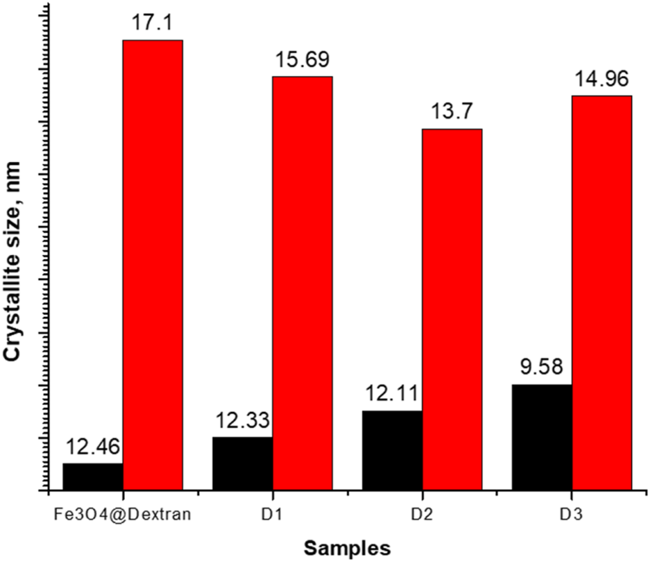 Figure 5 indicates that crystallite sizes were influenced by varying amounts of chrysin. The crystallite size of Fe3O4@Dextran NPs decreased upon drug loading, reducing from 17.1 nm (Fe3O4@Dextran) to 15.69 nm (Fe3O4@Dextran + D2) as the chrysin concentration doubled. An increase in drug molecules can interfere with crystallization, resulting in smaller and more finely distributed crystals (Mistry and Suryanarayanan, 2016). However, a slight increase in crystallite size was observed in Fe3O4@Dextran + D3, which may result from drug molecules saturating the surface. Once the surface of the Fe3O4 NPs becomes saturated, additional drug molecules may affect surface energy and diminish structural strain, leading to minor crystallite growth (Li et al., 2016).
