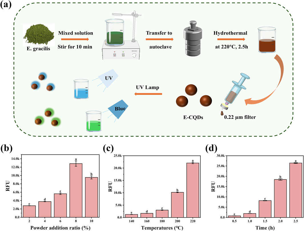 Figure 1. The optimization of the synthesis method for E-CQDs. (a) Schematic illustration of the synthesis process for E-CQDs. (b) Effects of different E. gracilis powder addition ratio, (c) reaction temperature, and (d) incubation time on the fluorescence intensity of E-CQDs. The letters (a–e) in (b–d) indicate significant differences between groups. Different letters denote significant differences (p < 0.05), while the same letters indicate no significant differences.