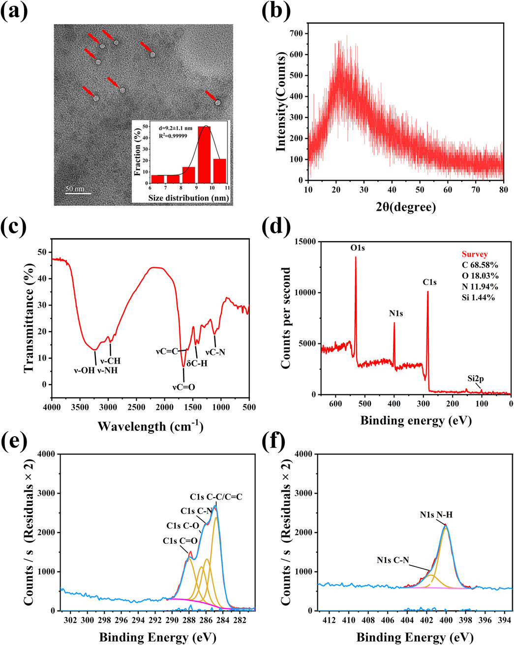 Figure 2. Structural Characterization of E-CQDs. (a) TEM image and size distribution of E-CQDs.The red arrows represent the E-CQDs; (b) XRD pattern of E-CQDs; (c) FTIR spectra of E-CQDs; (d) XPS survey spectra; (e) C 1s XPS spectra of E-CQDs; (f) N 1s XPS spectra of E-CQDs.