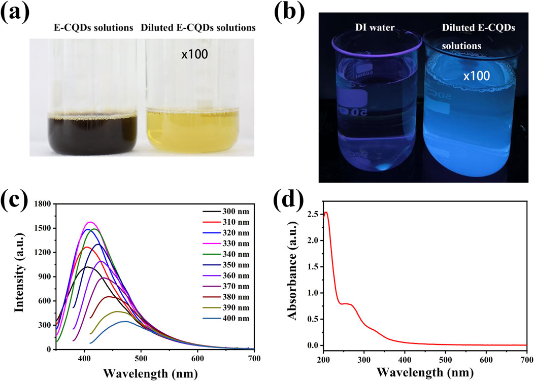 Figure 3. Optical properties of E-CQDs. (a) The image of the filtered original synthesized aqueous solution of E-CQDs (prepared from a mixture of 4.8 g of dry Euglena gracilis powder and 60 mL of DI water) and the 100x diluted E-CQDs solution; (b) The image of DI water and 100x diluted E-CQDs solutions under Uv; (c) Photoluminescence of E-CQDs with different excitation wavelength; (d) UV-vis absorption spectra of E-CQDs.