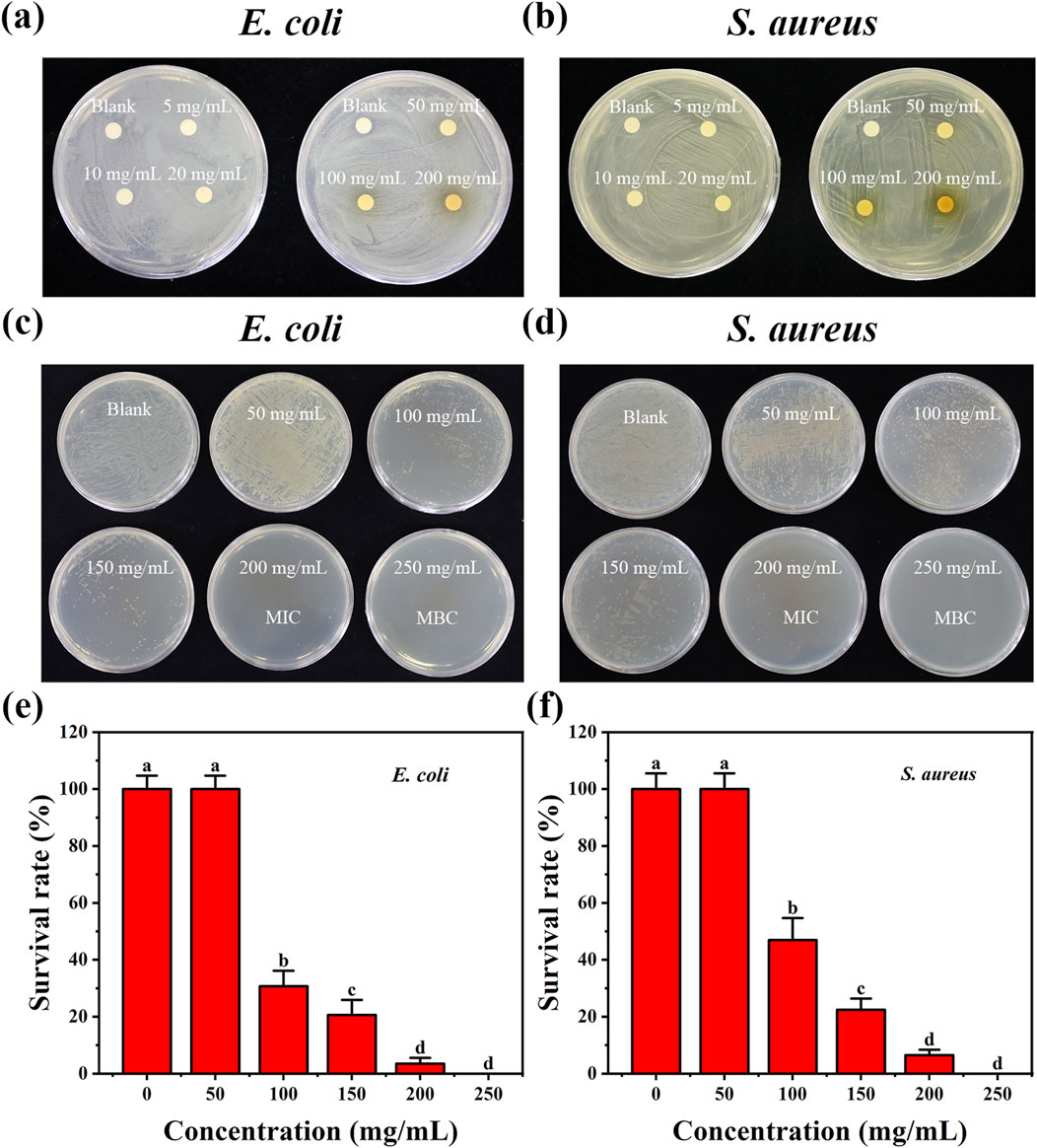 Figure 4. Antibacterial effects of E-CQDs at various concentrations on (a) E. coli and (b) Staphylococcus aureus as determined by disk diffusion assay, corresponding minimum inhibitory concentrations (MIC) and minimum bactericidal concentrations (MBC) for (c) Escherichia coli (E.coli) and (d) Staphylococcus aureus (S. aureus). Survival rates of (e) E. coli and (f) S. aureus exposed to different concentrations of E-CQDs. The letters (a–d) in (e–f) indicate significant differences between groups. Different letters denote significant differences (p < 0.05), while the same letters indicate no significant differences.
