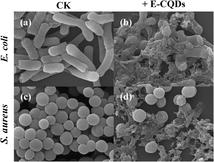It is reported that the bactericidal mechanism of CQDs can be characterized by the disruption of the bacterial membrane, leading to the leakage of cytoplasmic contents and ultimately culminating in cell apoptosis (Pant et al., 2023). SEM was used to image the bacteria in the presence of the E-CQDs (Figure 5). The morphology of E. coli and S. aureus changed significantly prior to and post the treatment with E-CQDs. In the absence of CQDs, the bacteria exhibited their typical sizes and morphologies: E. coli appears as rod-shaped bacteria (Figure 5a), whereas S. aureus has a spherical appearance and formed grape-like clusters (Figure 5c). Both types of bacteria presented smooth, intact surfaces. The cell membrane of the bacterial group treated with E-CQDs exhibited severe damage, with the surface becoming rough, deformed and significantly shrunken (Figures 5b,d). These changes may strongly suggest cell membrane damage (Bacellar et al., 2014). There was a hypothesis that S. aureus was less susceptible after treatment of CQDs than E. coli (Nie et al., 2020). Consistent with this supposition, intact S. aureus was still observable in Figure 5d while E. coli was seriously damaged (Figure 5b). It could be explained by the fact that E-CQDs may have a reduced ability to penetrate into the interior of S. aureus. Thus, the observed morphological changes in the bacteria may indicate alterations in the permeability of their membranes, which would affect the regulation of transmembrane transport and result in cell death.