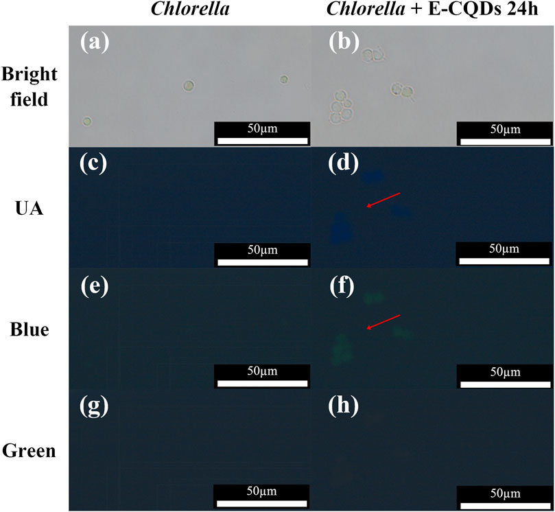 Figure 6. Fluorescent images of Chlorella cells with and without E-CQDs under different excitation wavelengths. (a) Bright-field image of Chlorella cells without E-CQDs; (b) Bright-field image of Chlorella cells with E-CQDs; (c) Fluorescent image of Chlorella cells without E-CQDs under UV irradiation; (d) Fluorescent image of Chlorella cells with E-CQDs under UV irradiation; (e) Fluorescent image of Chlorella cells without E-CQDs under blue light irradiation; (f) Fluorescent image of Chlorella cells with E-CQDs under blue light irradiation; (g) Fluorescent image of Chlorella cells without E-CQDs under green light irradiation; (h) Fluorescent image of Chlorella cells with E-CQDs under green light irradiation.