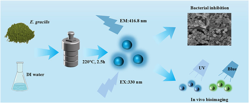 Hence, in this study, E. gracilis were used as precursors for CODs without any additional chemicals. Euglena gracilis-drived CQDs (E-CQDs) with down-conversion effects were firstly synthesized using a one-step and a low cost hydrothermal procedure. The structural, composition, and properties of the prepared CQDs were thoroughly investigated. Biological applications including antibacterial effects and bioimaging were carried out. This research not only provides a novel approach for preparing CQDs using E. gracilis as a new microalgal material but also offers valuable insights into their potential applications in antibacterial and bioimaging fields.