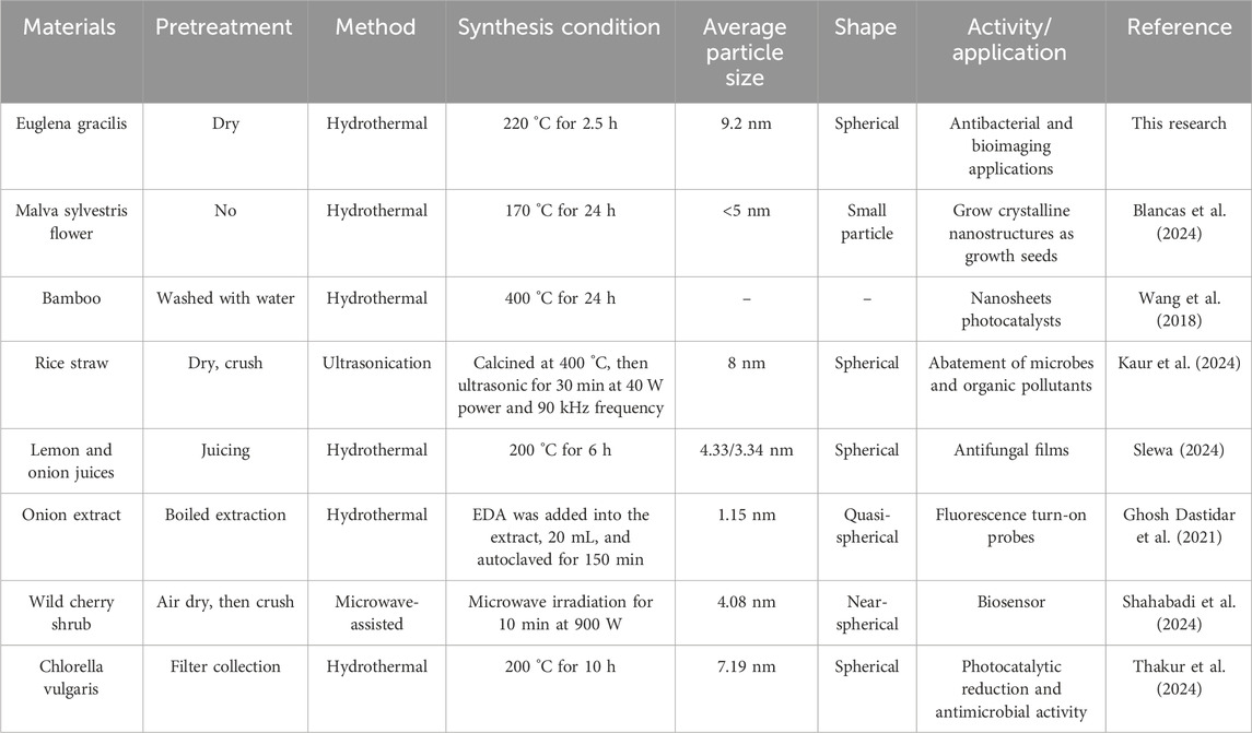 In general, natural resources, such as plant leaves and peels, are widely used as sustainable carbon sources in environmentally friendly synthetic processes (Mindivan and Göktaş, 2023). Currently, a diverse range of biological materials are being utilized for the environmentally friendly synthesis of CQDs. These materials include Malva sylvestris flowers (Blancas et al., 2024), bamboo (Wang et al., 2018), rice straw (Kaur et al., 2024), and various other biological substances. For instance, lignin presents as a renewable source of carbon nanoparticles. A novel biobased material was synthesized via Fenton reaction, employing lignin as natural grafting additives onto nanocellulose surfaces through in situ polymerization of coniferyl alcohol. The material exhibited dual antioxidant properties and organic radical stabilization in cellulose nanocomposite films (Gerbin et al., 2020). The synthesis of novel kraft softwood lignin-derived CQDs was also reported, and the CQDs promote cell attachment within 24 h and sustain it for at least 7 days without any adverse or toxic effects. The data suggested that the CQDs could be suitable for in vivo cell culture applications (Christoph et al., 2024). Microalgae, photosynthetic microorganisms, are regarded as another sustainable resource with potential applications across various fields. These organisms exhibit remarkable species diversity and are rich in valuable bioactive compounds (Guehaz et al., 2023). Compared to other materials employed in the synthesis of carbon quantum dots (CQDs), microalgae offer several distinct advantages. These include diminutive size, rapid reproduction rates, environmental friendliness, and ease of cultivation, rendering them highly suitable for the “bottom-up” synthesis strategy (Ortiz Montoya et al., 2014). Notably, Chlorella has been extensively utilized as a green biological material for CQD synthesis, yielding CQDs with commendable properties (Dong et al., 2021; Wang L. et al., 2024). It was reported that the fabrication of nitrogen selfdoped carbon dots (CDs) via Chlorella pyrenoidosa and its use as a fluorescent link were carried out, and the material has a spherical morphology of the particles with sizes ranging from 3 to 6.5 nm (Guo et al., 2021). Another CDs were fabricated via the hydrothermal treatment of Chlorella pyrenoidosa and the ability for the Fe3+ ion is also further analyzed. The particles were emitted blue fluorescence under UV exposure (365 nm) (Zhang et al., 2022a). Moreover, microalgae-derived CQDs have also been employed as an eco-friendly modifier to facilitate the formation of nano-MnS/FeS composites, thereby significantly enhancing the removal efficiency of Cd2+ ions. This application underscores the potential of microalgae-CQDs to serve as a versatile and sustainable green modifier for mediating the synthesis of various metal sulfides, opening new avenues for environmental remediation and material science (Wang et al., 2023).