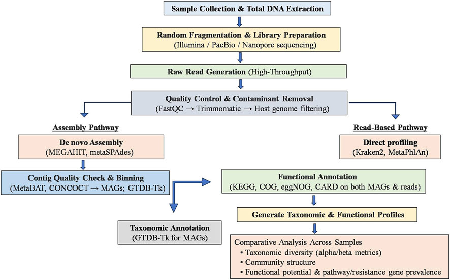 WGS metagenomics begins with sample collection and total DNA extraction, followed by random fragmentation and high-throughput sequencing (e.g., Illumina, PacBio, Nanopore). After quality control and contaminant removal (using tools like FastQC and Trimmomatic), reads are assembled de novo into contigs and binned into putative genomes (MAGs) using assemblers (e.g., MEGAHIT, metaSPAdes) and binning tools (e.g., MetaBAT, CONCOCT). These assemblies and unassembled reads are then annotated taxonomically (with tools like Kraken2, GTDB-Tk for MAGs, or Kraken2, MetaPhlAn for reads) and functionally profiled against databases such as KEGG, COG, eggNOG, and CARD to reveal metabolic pathways and resistance genes (Pérez-Cobas et al., 2020; Bharti and Grimm, 2021; Saenz et al., 2022). The final step involves comparing taxonomic and functional profiles across samples to assess microbial diversity, community structure, and functional potential (Figure 4).